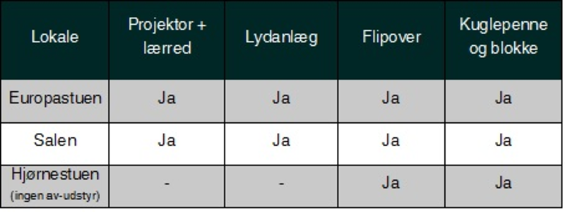 Lokalerne er smagfuldt indrettede og har behagelige stole samt borde. De er velegnede til møder på op til 150 personer i biografopstilling. I skolebordsopstilling kan op til 60 kursister sidde komfortabelt og ved lange borde op til 120 personer.
